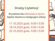 Szanowni Czytelnicy! Zaparszamy do Biblioteki w Ratuszu w następuące soboty października: 11, 18 i 25. Biblioteka będzie czynna w godzinach od 9:00 do 13:00.