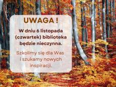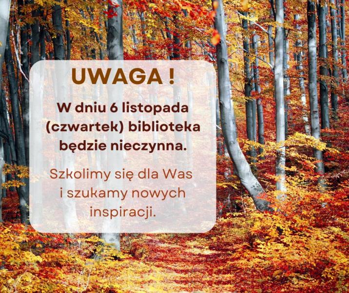 Szanowni Czytelnicy! W dniu 6 listopada (czwartek) Biblioteka będzie nieczynna. Szkolimy się dla Was i szukamy nowych inspiracji. Przepraszamy za utrudnienia!
