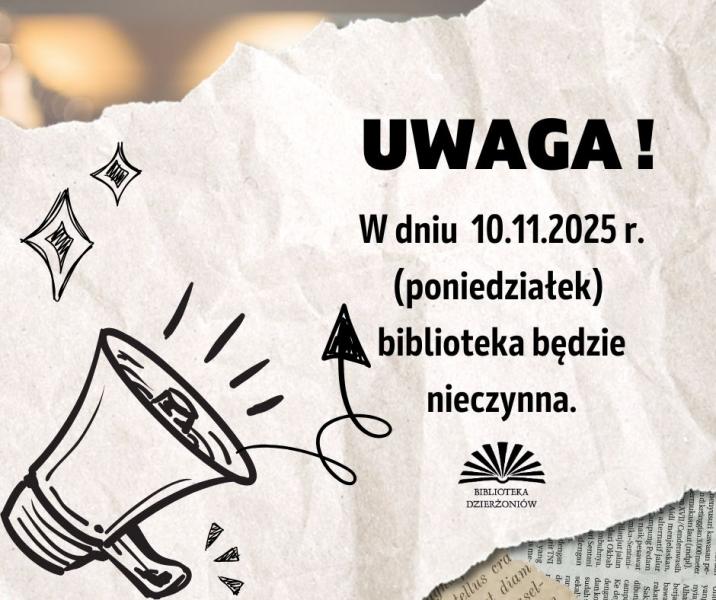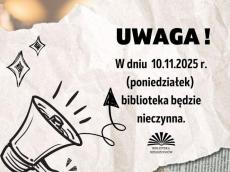 Szanowni Czytelnicy! Uprzejmie informujemy, że w dniu 10 listopada (poniedziałek) Biblioteka będzie nieczynna!