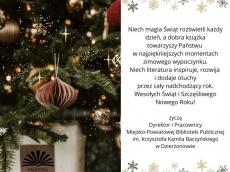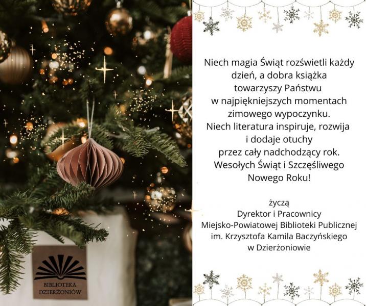 Niech magia Świąt rozświetli każdy dzień, a dobra książka towarzyszy Państwu w najpiękniejszych momentach zimowego wypoczynku. Niech literatura inspiruje, rozwija i dodaje otuchy przez cały nadchodzący rok. Wesołych Świąt i Szczęśliwego Nowego Roku życzą Dyrektor i Pracownicy Miejsko-Powiatowej Biblioteki Publicznej im. Krzysztofa Kamila Baczyńskiego w Dzierżoniowie!